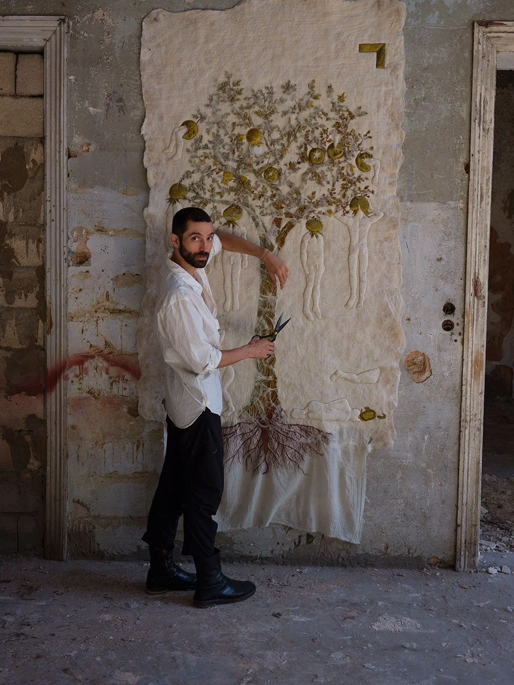 Adrian Pepe is a Honduras-born fiber artist based in Beirut. His practice focuses on textile traditions of the Levant, working closely with local artisans to reactivate ancestral craft processes within contemporary art and installation. Through materials such as wool, hide, and fiber, his work explores themes of materiality, ecology, labor, and cultural memory, often taking the form of large-scale textile pieces, soft sculptures, and site-specific installations.